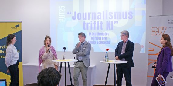 25. OKTOBER 2025 | 10 UHR | Am 25. Oktober 2025 war die Media University Frankfurt Gastgeber des Hessischen Jungjournalistentags (#JJT25). Mehr als 100 junge Medieninteressierte – darunter Studierende, Volontärinnen und Volontäre sowie Schülerinnen und Schüler – nutzten die Gelegenheit, sich über aktuelle Entwicklungen im Journalismus zu informieren und wertvolle Kontakte zu knüpfen. Im Mittelpunkt stand das Top-Thema „Künstliche Intelligenz im Journalismus“.